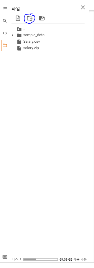 해제가 끝났으면 colab은 동기화 하는 속도가 느려 파란원이 쳐진 버튼을 클릭합니다.