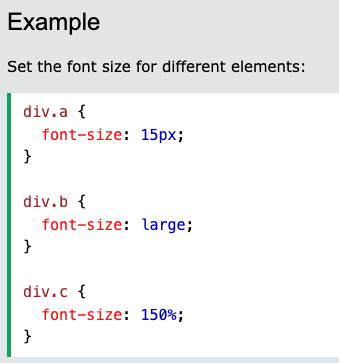거기서 예제들을 볼 수 있는데, font-size를 통해 픽셀, h1 폰트사이즈의 퍼센테이지, property value 중 하나를 지정할 수 있다.